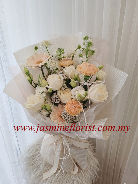 (PRE- ORDER) White Rose, Champagne Carnation, Champagne Gerbera, White Mathiola, Eustoma Etc.. HB246