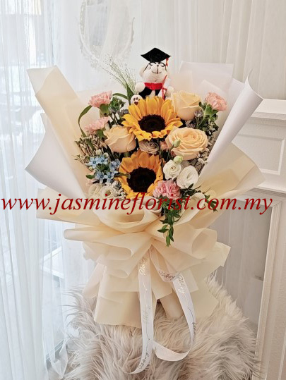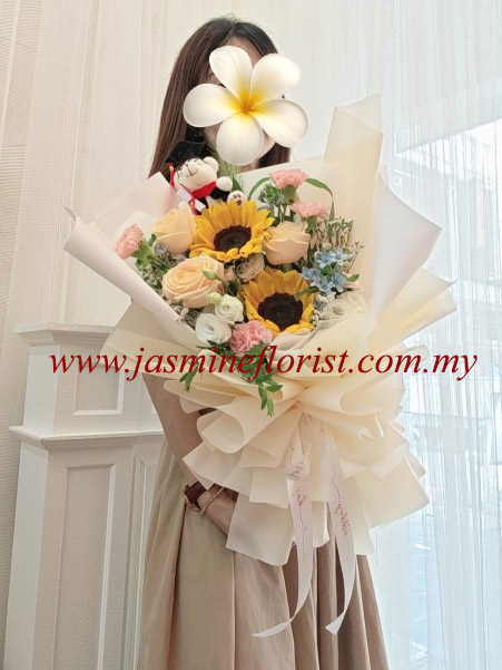 Sunflower, champagne rose, pink carnation, small convo bear GR011